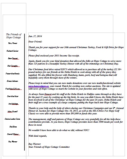 Thank you letter for kind donations that allowed the folks at Hope Cottage to serve more than 125 patrons to a beautiful Turkey Dinner with all of the trimmings on Christmas Day.